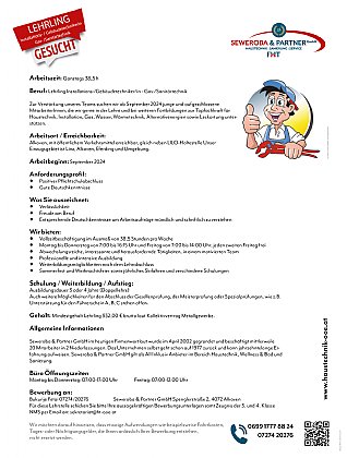 Zur Verstärkung unseres Teams suchen wir ab September 2024 junge und aufgeschlossene MitarbeiterInnen, die wir gerne in der Lehre und bei weiteren Fortbildungen zur Topfachkraft für Haustechnik, Installation, Gas, Wasser, Wärmetechnik, Alternativenergien sowie Leckortung unterstützen.